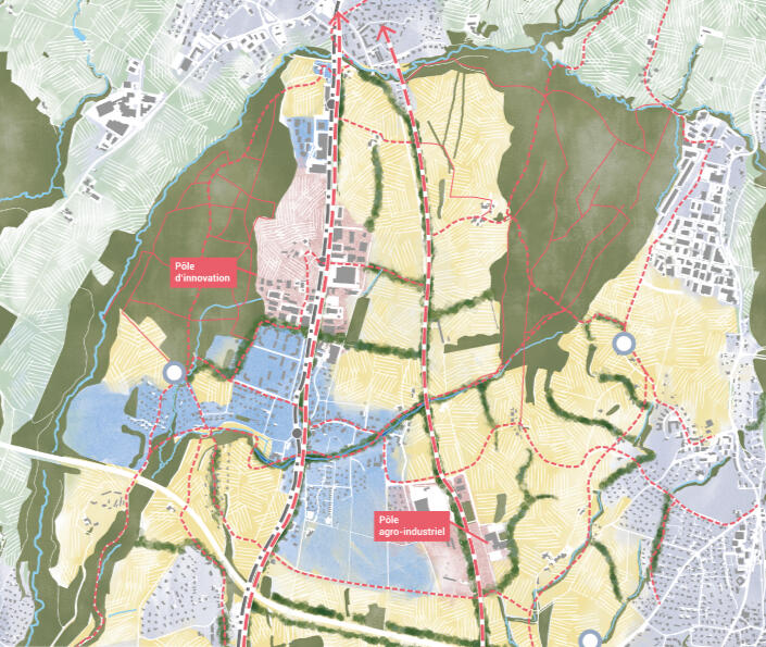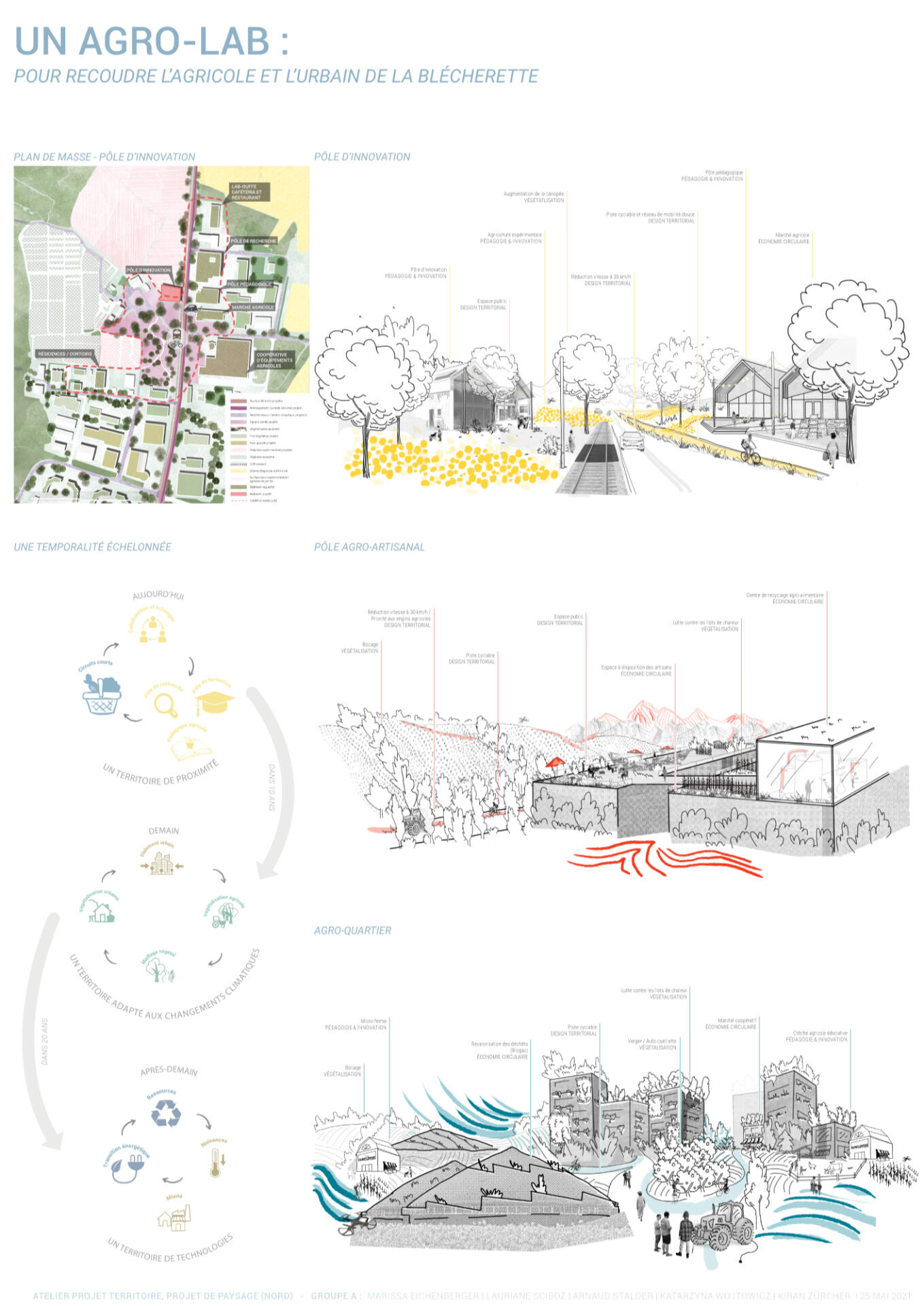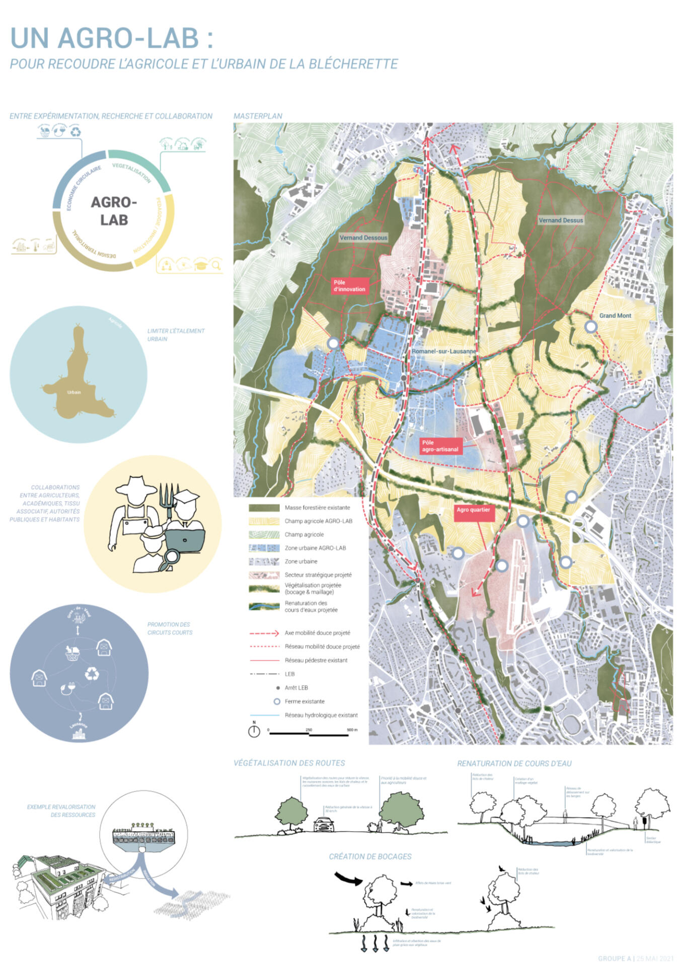 To avoid such a collapse, the AGRO-LAB project aims to reconnect the urban and agricultural tissue of La Blécherette. The latter essentially pursues the logic of experimentation and innovation to avoid the isolation of agriculture, which would be contrary to the evolving nature of the territory. Conceptually, four programme elements surround the project: education and innovation, green enviroment, circular economy and territorial design. To articulate the whole and to define the role of the different actors, a charter was established as a framework document for spatial planning. More concretely, three main strategic intervention sectors have been established to crystallize the AGRO-LAB concept: an innovation pole fostering research and training infrastructures, an agri-craft pole whose aim will be to develop local trade and an agri-neighborhood symbolizing the meeting between the agricultural and urban worlds. The aim of the AGRO-LAB development project is therefore to create a greener urban area and a more cooperative agriculture concentrated on a local scale.M. Eichenberger, L. Sciboz, A. Stalder, K. Wójtowicz and K. Zürcher