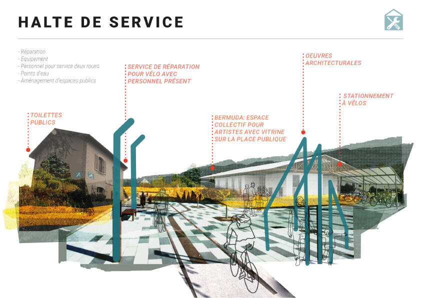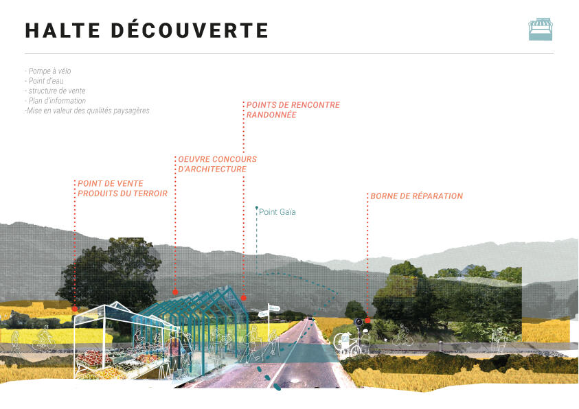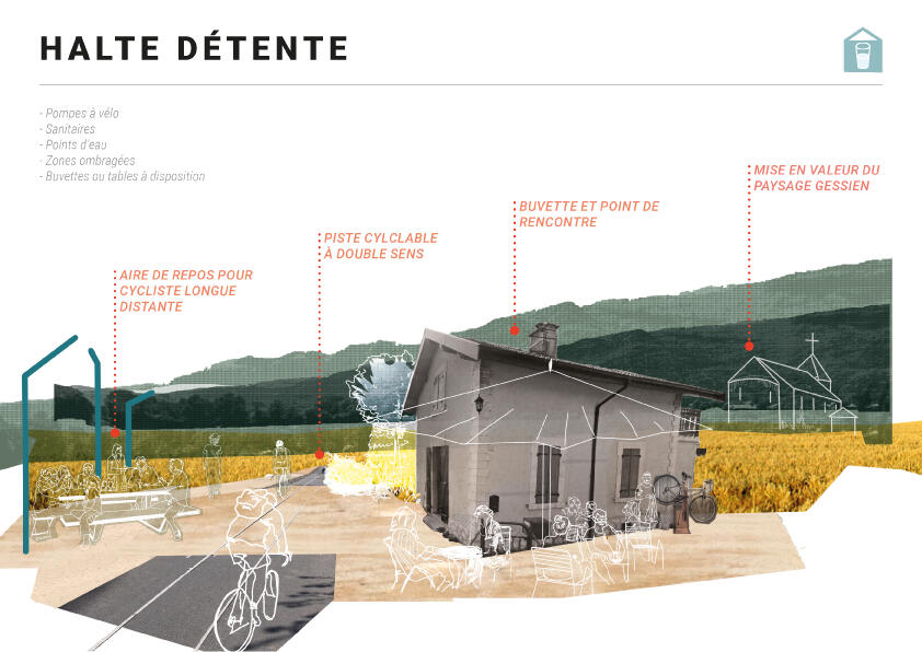 In the second phase of the atelier, the objective was to specify a problem and present the proposed project. Our group focused on the development of a network in the sense of eco-mobility, that would on one hand connect the characteristic villages on the base of the Jura via the transformation of the disaffected railroad to a cycling lane.The projects proposes different typologies of stops, to reconnect and discover the qualities the Pays de Gex offers to locals and external visitors during different seasons. There are service stops to guarantee a safe passage on the cycling lane with reparation shops, but more important are the so-called “discovery stops” and “relaxing stops” that aim to implant qualities such as access to local qualities such as food markets, bars and cafes in the urbanised areas and simple refreshing and access points to hiking paths in remote parts of the lane.With all those different stops, the projects aim to value the diverse qualities of the landscape and nature in the perimeter and to reconnect the suburban areas with each other.The proximity to Geneva and Nyon is crucial from a development and mobility perspective, projected networks of public transport and cycling lanes can be integrated into the proposed project and pose attractive alternatives to the commute by car, as shown in case studies in the suburbs of London or Copenhagen.M. Eichenberger , E. Dodaj, P. Gilli, J. Ruetschi and K. Zürcher - Ilustrations of haltes: M. Eichenberger