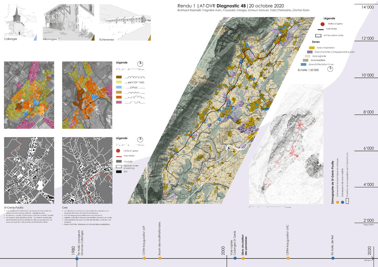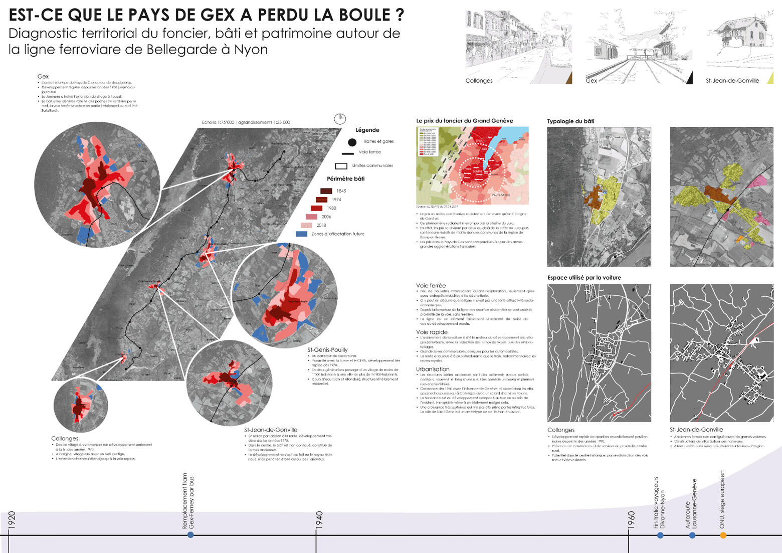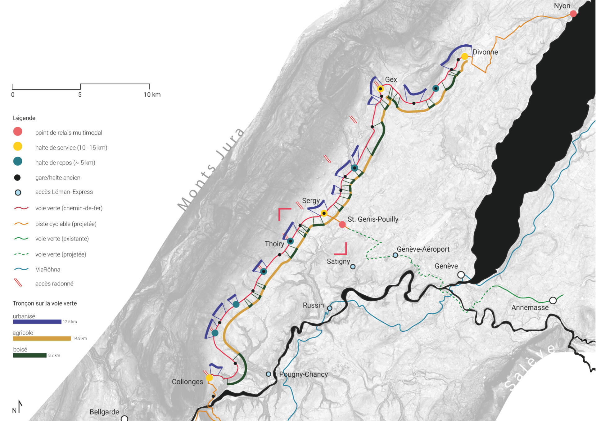 During the diagnostic phase, we analysed the historical development of the different villages along the disaffected railroad and at the base of the Jura mountain range. These villages possess their proper qualities linked to agriculture and local heritage, while in proximity to international Geneva and CERN. The villages developed therefore in different ways, which was observed while analysing the typologies of buildings and zones. The rising development and mobility close to the cities are also observable by the considerable surfaces dedicated to transport by car and parking spaces. The tensions between the growing development due to the city's need and landscape and agricultural qualities are illustrative for the space. Finally, disposable surfaces for future developments are extremely rare and hence these qualities are heavily at risk.R. Burkhart, S. Fragnière, G. Pusceddu, S. Schwyn, C. Vida and K. Zürcher