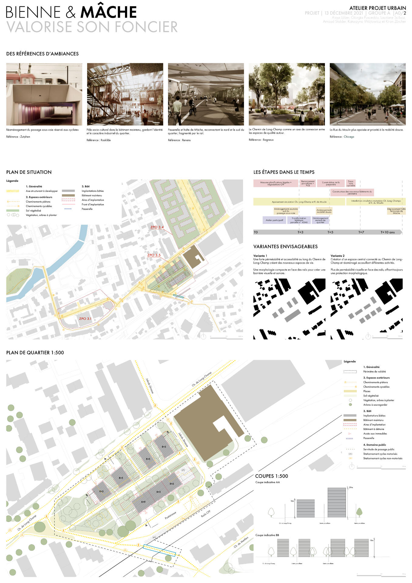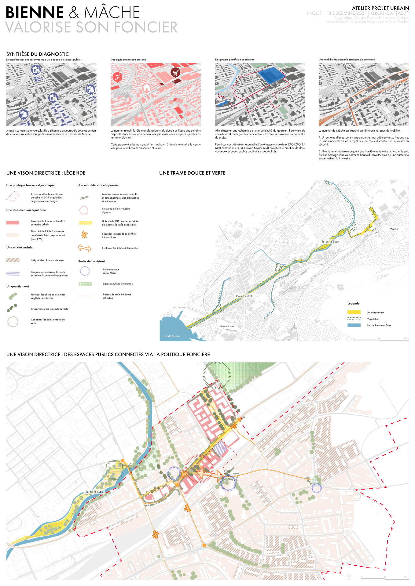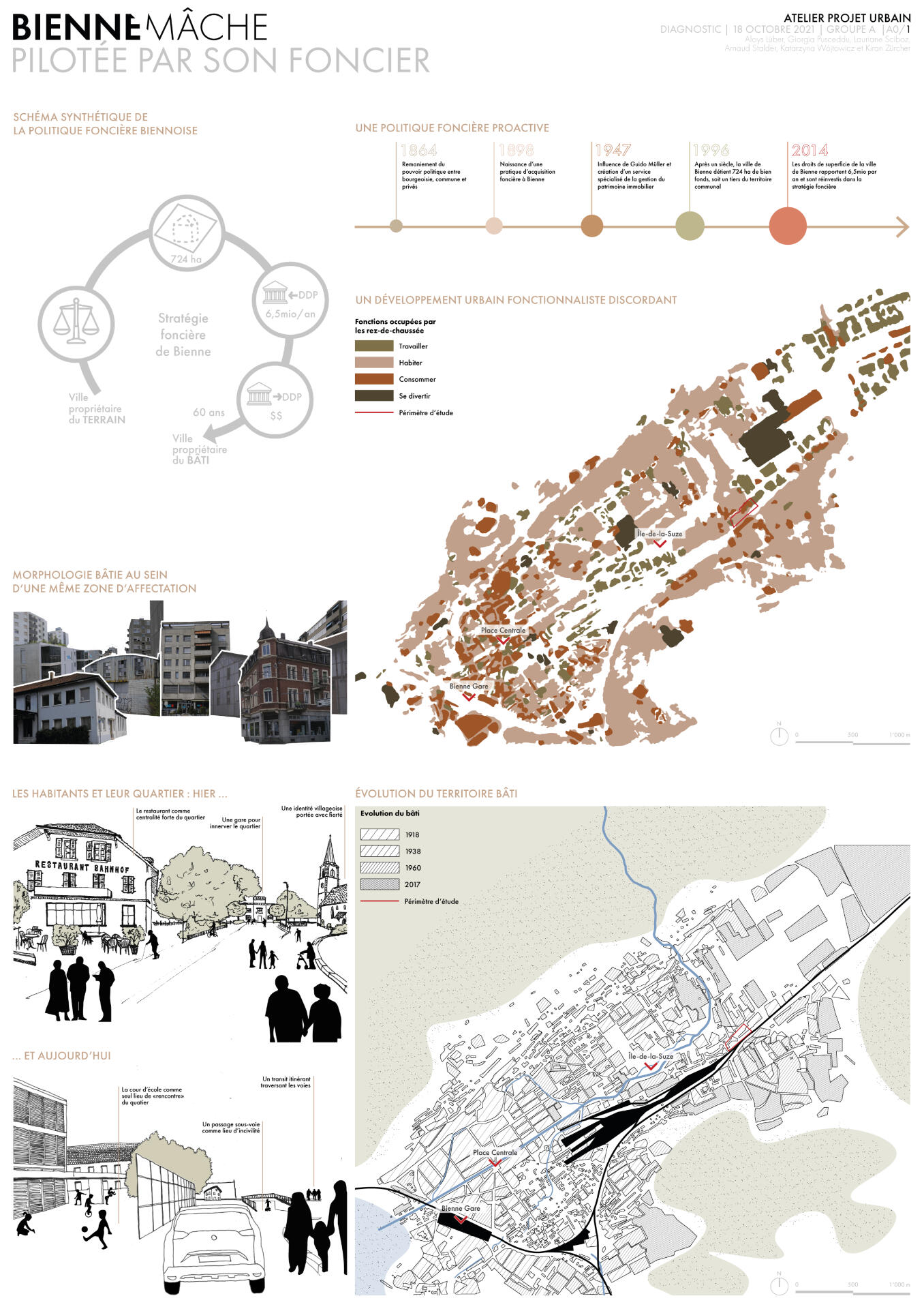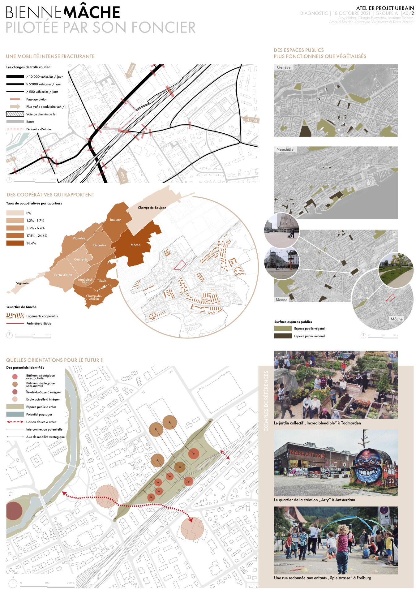 In the diagnostic phase, the evolution of the city of Biel has been taken into account for defining the qualities and challenges given for the analyzed perimeter. In particular the historical development with the functionalist perspective towards the new city centre and the industrial character of the city. Another major takeaway is the multiple cooperative housings in the quarter concerned and the potential benefits for the municipality.The perimeter itself is in the centre of the neighbourhood Mâche, a quarter being fractured by road and train traffic. Further the city, and in particular the quarter are absent of qualitative public space. This shortcoming will be addressed in the project phase by linking the existing parc and planned project together by mobilising the advantage of the city's land policy.