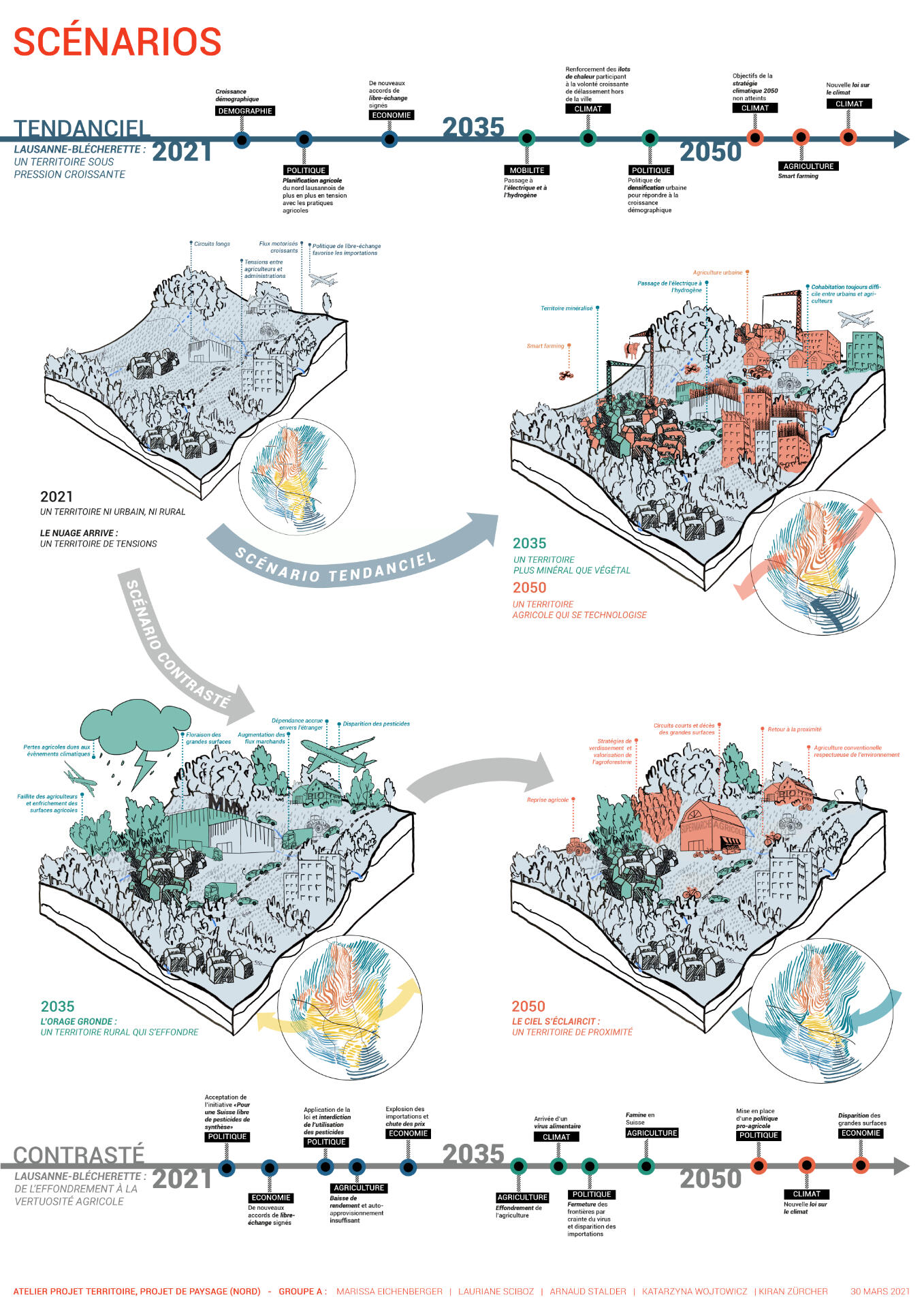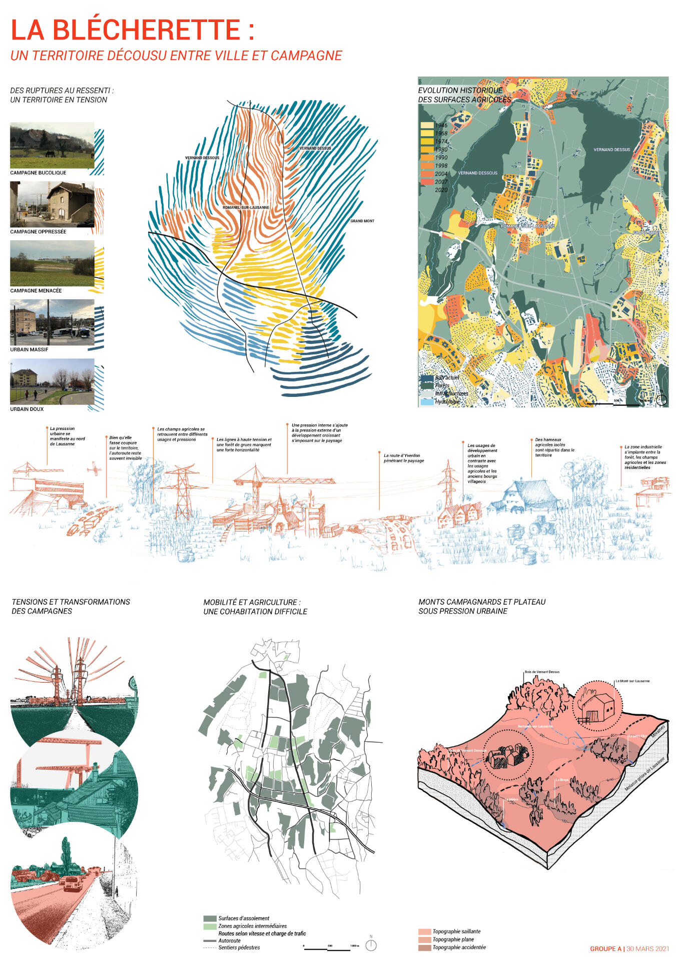 Attached to its original rural environment, neighbouring the growing urbanisation of the city of Lausanne, the territory studied at La Blécherette is in the middle of a vast and abstruse grey zone which, throughout its existence, has hosted a series of heterogeneous objects. From the LEB railway line inaugurated in 1889 to the motorway of the 1960s, via the establishment of the airport in 1911, it is indeed a series of consequent territorial disruptors that have seen the light of day on this agricultural territory. To get a closer look at such a territory, two surveys were carried out and led to the spatial identification of several types of countryside and urban areas. These are defined by different degrees of greenness, density, preservation, motorisation and industrialisation, all of which bear witness to the poorly planned development of space and the gradual disappearance of agriculture, both in number and in diversity. In concrete terms, agricultural plots are being fragmented by urban densification and high-speed roads. This sad picture is also painted by the farmers themselves. Indeed, from the constant feeling of encroachment to that of an uncertain future, all in a universe that is difficult to relate to the pure countryside, farmers logically wonder about their survival. Four main issues emerge from this diagnostic phase: cohabitation, identity, politics and the agricultural market, and urbanisation.Based on these, two scenarios are established. The first, known as the trend scenario, is based on an increase in motorised traffic, densification and free trade policies, which condemns agriculture to large, monocentric and technological farms. The second, so-called contrasted scenario assumes the acceptance of the initiative "For a pesticide-free Switzerland" and thus foresees a sharp decline in productivity, which will drive many farms into bankruptcy. Only the release of a virus that disrupts the world market and turns Switzerland in on itself will revive local agriculture.