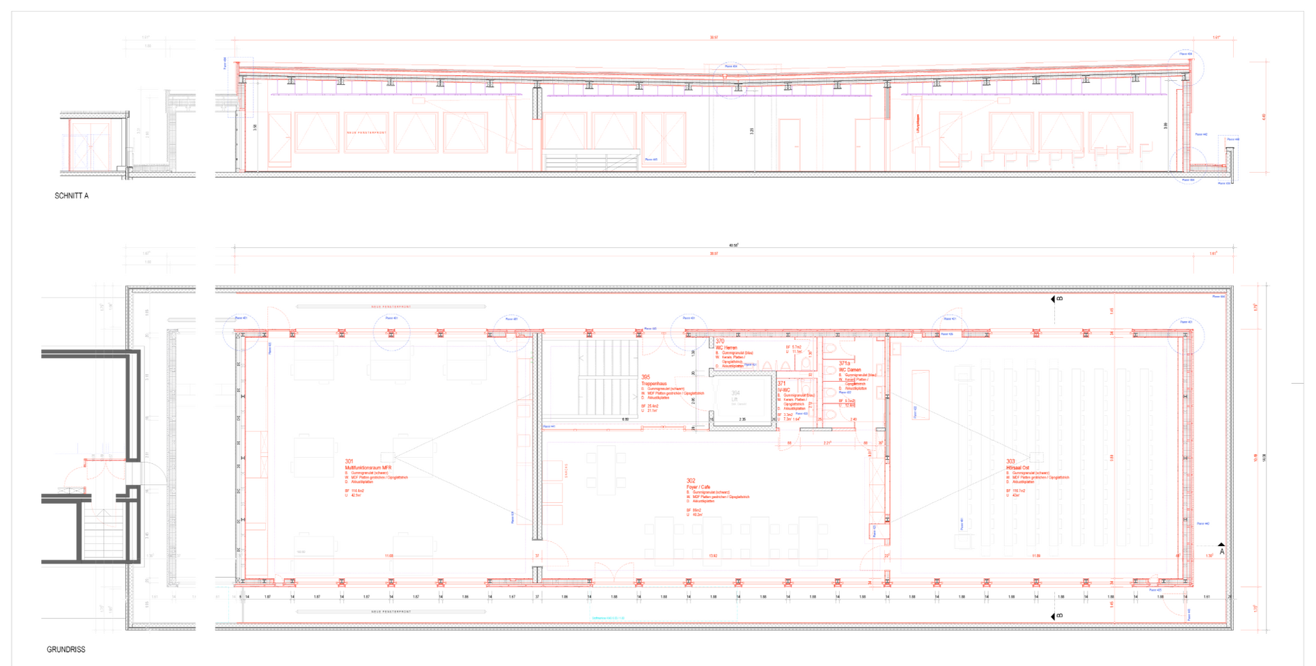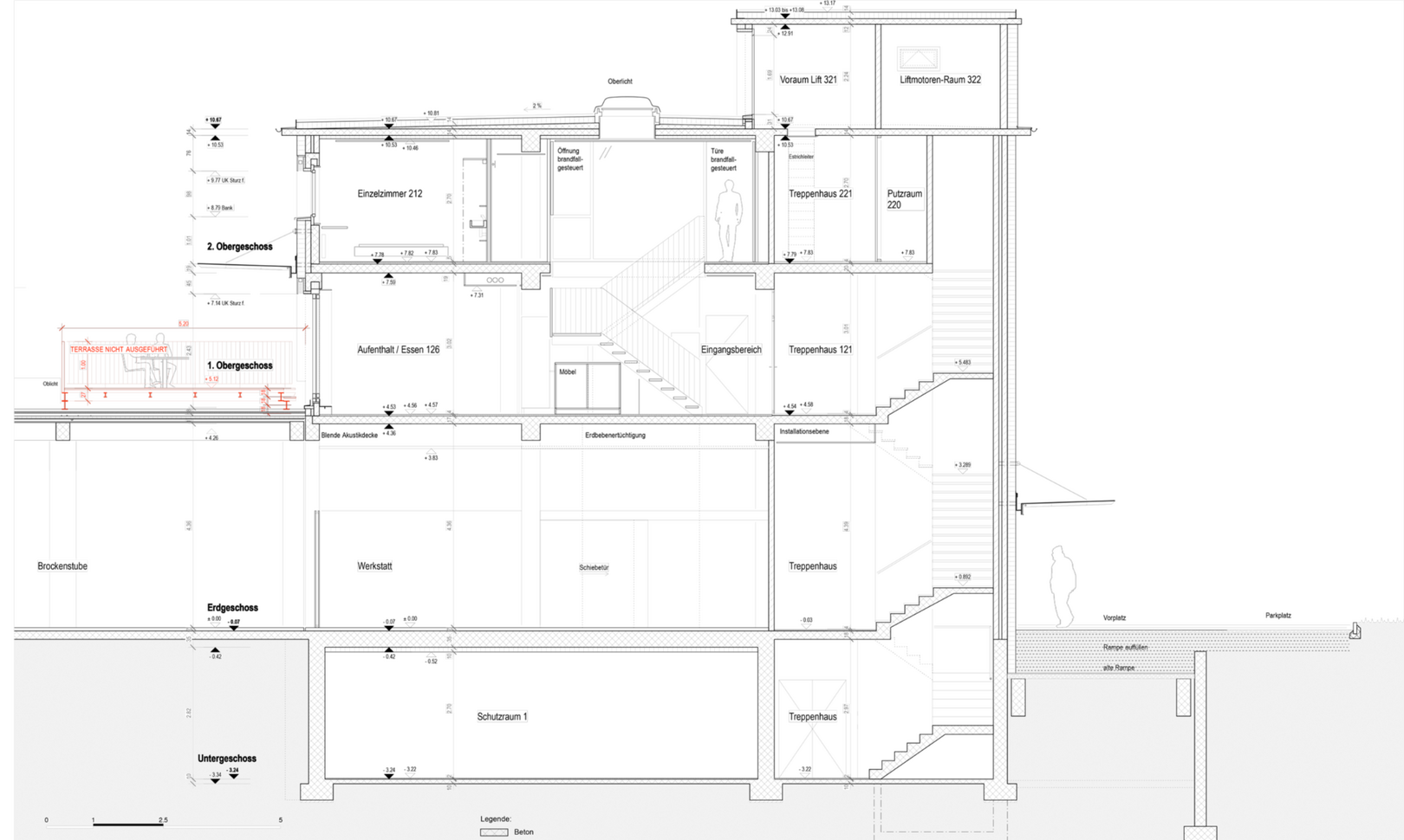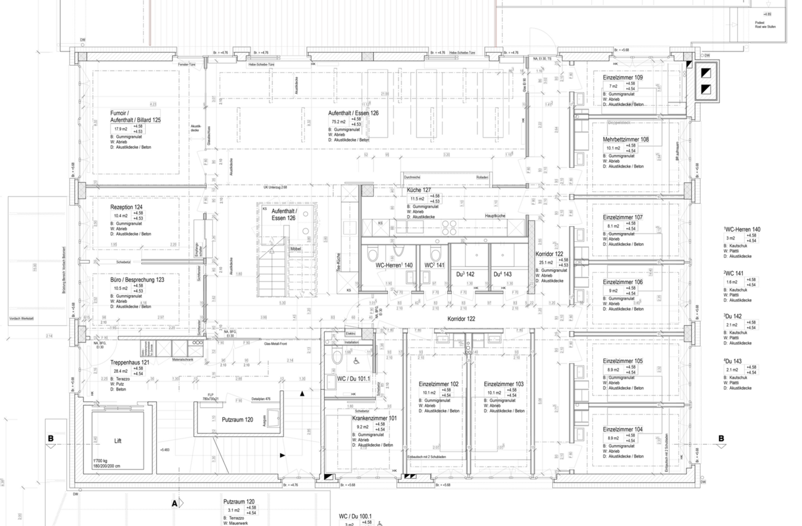 Ground plan and section 1:50 of a public dorm for the swiss salvation army. © 2013 m+b architekten