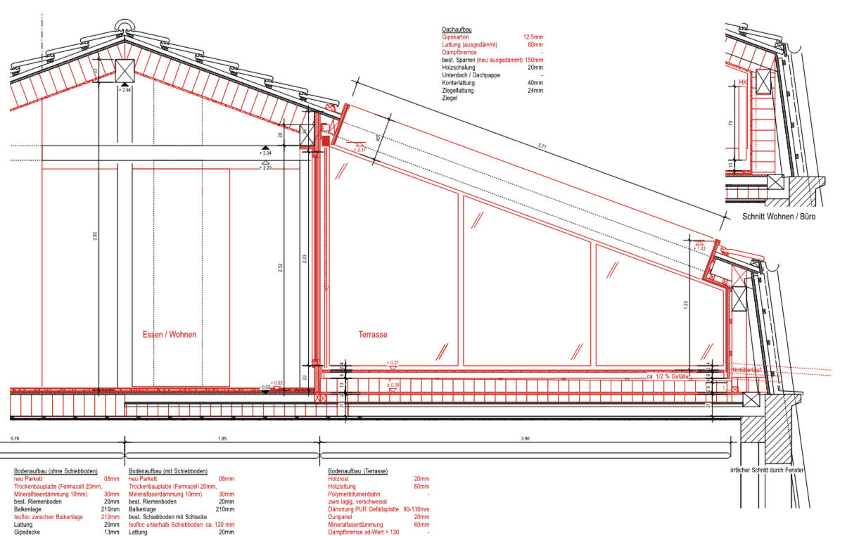Ground plan 1:50 and section 1:20 of an attic appartment. © 2012 m+b architekten