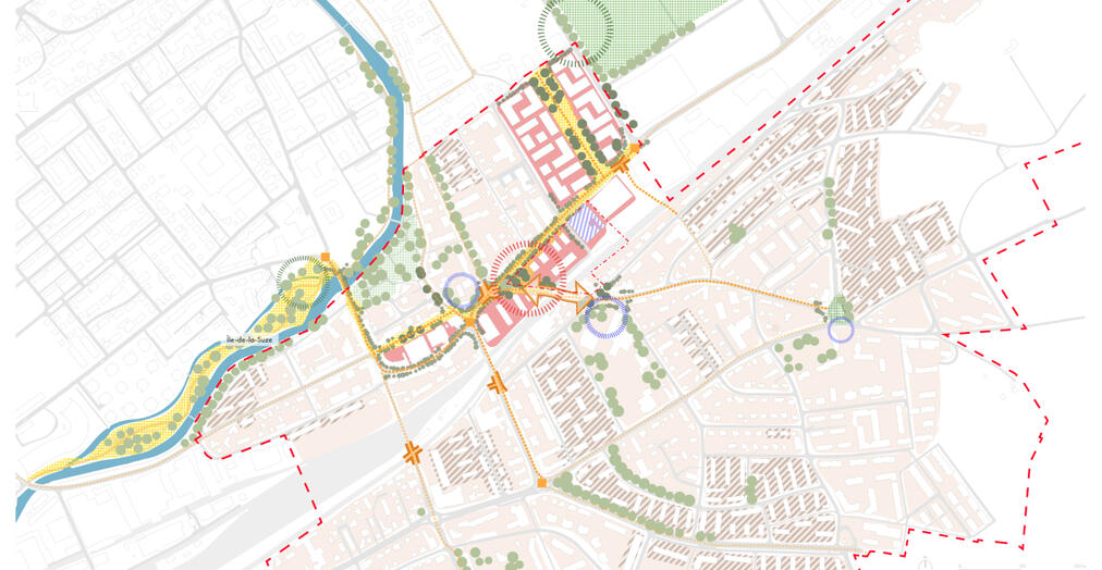 In the project phase a directory vision has been established, putting forward the connecting quality space to be created through the advantages of the city's land policies and the cooperative housing in place. This network seeks to connect the existing and planned projects at the city scale through a green axe following the river Suze and the existing parc in proximity and space favouring slow mobility and less road traffic, including a connecting passage to the south of the quarter.In the second stage, these directory principles, have been integrated into an operational proposition for the perimeter to put in place this strategy. Including a variant that creates open public spaces in the north and closed buildings and a tower in the south, to protect against the railway noise.