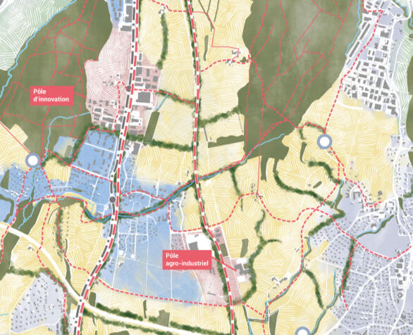 To avoid such a collapse, the AGRO-LAB project aims to reconnect the urban and agricultural tissue of La Blécherette. The latter essentially pursues the logic of experimentation and innovation to avoid the isolation of agriculture, which would be contrary to the evolving nature of the territory. Conceptually, four programme elements surround the project: education and innovation, green enviroment, circular economy and territorial design. To articulate the whole and to define the role of the different actors, a charter was established as a framework document for spatial planning. More concretely, three main strategic intervention sectors have been established to crystallize the AGRO-LAB concept: an innovation pole fostering research and training infrastructures, an agri-craft pole whose aim will be to develop local trade and an agri-neighborhood symbolizing the meeting between the agricultural and urban worlds. The aim of the AGRO-LAB development project is therefore to create a greener urban area and a more cooperative agriculture concentrated on a local scale.M. Eichenberger, L. Sciboz, A. Stalder, K. Wójtowicz and K. Zürcher
